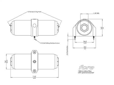 Use to upgrade Fore Innovations 88mm (previously called F-10) fuel filter to new 128mm “long” filter. Includes new filter body (tube only) and a new 128mm filter element of your choice. If you have our filter bracket on your old filter, it will fit the 128mm body. Please refer to the drawings to ensure adequate installation room.