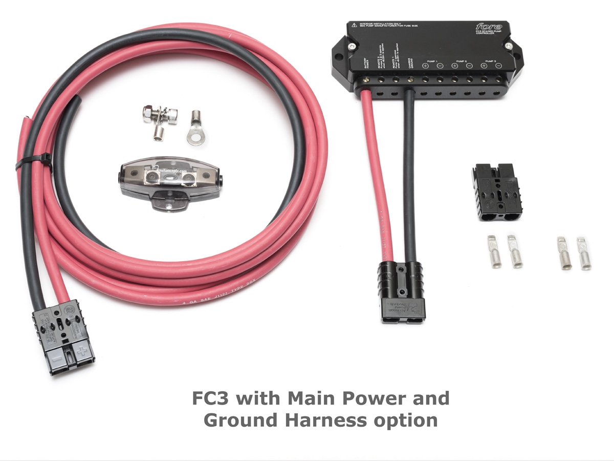 - Add Main Power and Ground Harness: 15′ 4 AWG power, 3′ 4 AWG ground assembled to APP® power connector with 100A inline fuse.