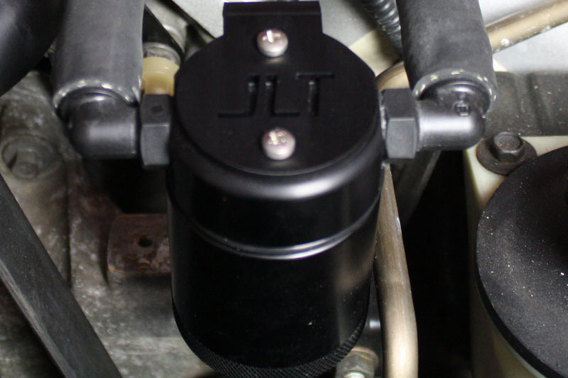 To combat this, we have developed an oil separator of our own design. Milled from solid billet aluminum this is a rock solid piece. It has a knurled tank base for easy removal to drain the spent oil and an O ring seal to prevent any leaks. We took this unit a step further and added a metal mesh filter to the intake side that collects the vapors, allowing them to grow into larger oil droplets and drains back into the tank. The tank holds 3 oz of fluid, while that may not sound like a lot, you shouldn’t see that much oil in your PCV system. Drain it every 3500-4000 miles and you will never come close to filling it.