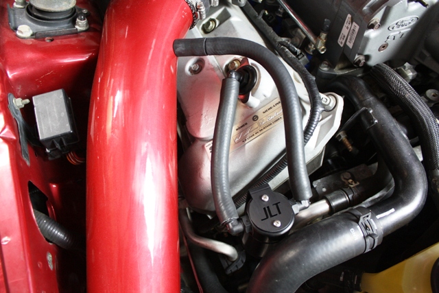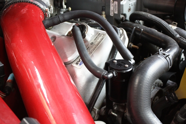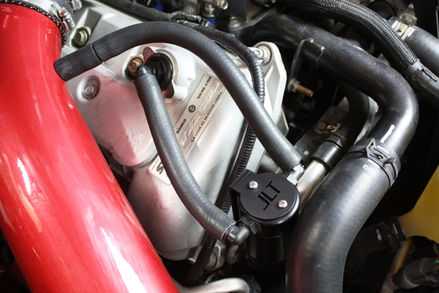 To combat this, we have developed an oil separator of our own design. Milled from solid billet aluminum this is a rock solid piece. It has a knurled tank base for easy removal to drain the spent oil and an O ring seal to prevent any leaks. We took this unit a step further and added a metal mesh filter to the intake side that collects the vapors, allowing them to grow into larger oil droplets and drains back into the tank. The tank holds 3 oz of fluid, while that may not sound like a lot, you shouldn’t see that much oil in your PCV system. Drain it every 3500-4000 miles and you will never come close to filling it.
