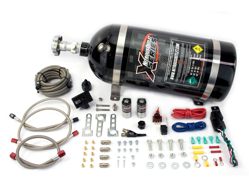 Single Nozzle. This system includes everything needed to install a wet single nozzle system capable of flowing 200 HP of nitrous. 10lb nitrous bottle, solenoids, hoses, wiring, hardware and jetting for up to 200HP included.